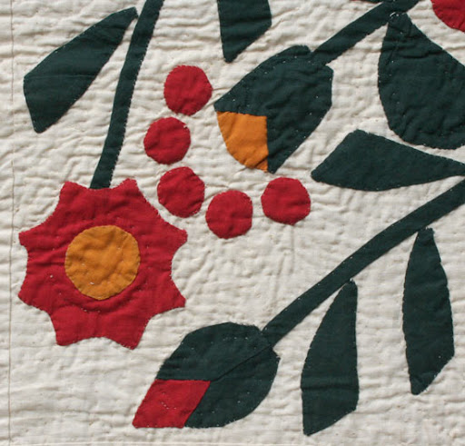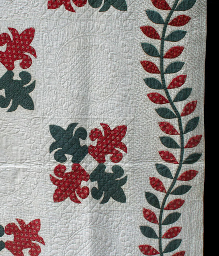 This one, which we call "Christmas Star," dates to about the 1880's. The applique design is simpler than in some of the early quilts, but this qt maker did not hold back on her elaborate hand quilting!